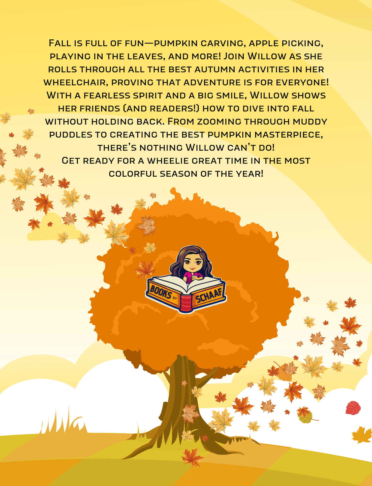 Welcome to Willow's world, where adventure is always around the corner-especially in the fall! As the leaves turn bright orange and the air grows crisp, Willow is ready to dive into all the fun autumn has to offer. Whether she's racing through an apple orchard or making a splash in muddy puddles, Willow's wheelchair never slows her down. With her fearless attitude and a big, joyful heart, she shows us that trying new things and embracing the beauty of fall is for everyone-no matter how you roll!