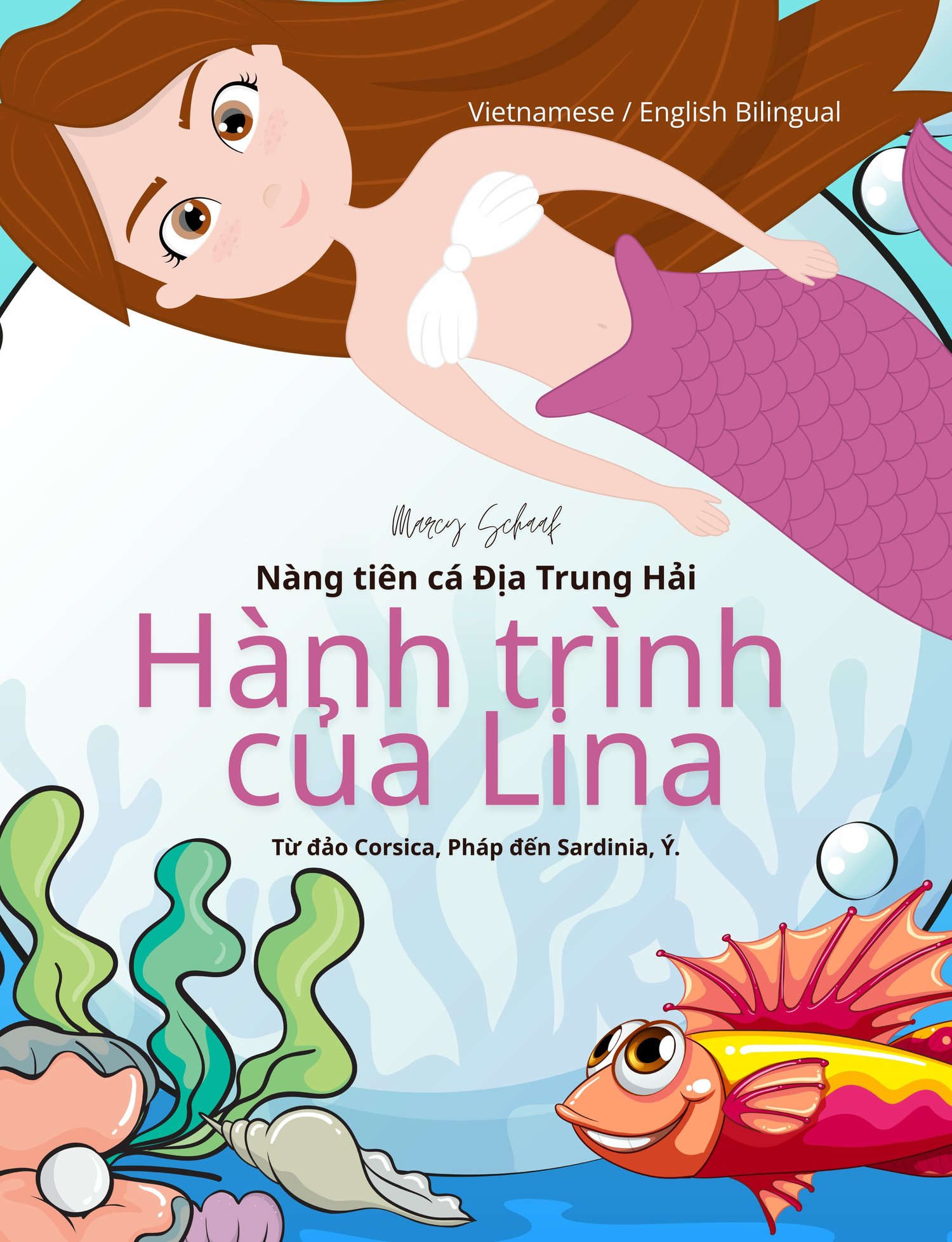 Những nàng tiên cá Địa Trung Hải: Hành trình của Lina từ Corsica đến Sardinia. Gặp gỡ Lina - nàng tiên cá đuôi tím với đôi vây nhanh nhẹn và tinh thần vui tươi. Khi con tàu rời Corsica, Lina lao lên phía trước, hướng dẫn đàn cá tránh đường an toàn trong khi vẫn chăm chú quan sát từng tia nước bắn tung tóe. Ngoài khơi xa, lũ trẻ reo lên kinh ngạc trước đàn sứa mặt trăng phát sáng, nhấp nháy như những chiếc ô dưới sóng biển. Gần hơn với Sardinia, những con ngựa hoang phi nước đại trên sóng và lăn lộn trên cát, trong khi những chú dê tinh nghịch loạng choạng trên những vách đá ven biển. Mỗi chặng đường của chuyến đi đều mang đến những tiếng cười và sự ngạc nhiên mới. Cuối cùng, Lina lẻn vào những hang động pha lê ở Sardinia, nơi chị gái Sofia đang đợi cô trong một hồ nước ẩn. Cùng nhau, họ phát hiện ra một chiếc vòng cổ hình trái tim lấp lánh-trước khi Sofia tiếp quản chuyến đi và dẫn dắt con tàu hướng về Malta. Cô ấy là một trong số nhiều chị em gái! Tại mỗi cảng, một nàng tiên cá Địa Trung Hải mới sẽ tham gia hành trình - bảo vệ tuyến đường du lịch và giữ cho trẻ em luôn bình tĩnh, vui vẻ và an toàn. Hãy cùng đắm mình vào hành trình phiêu lưu của Lina-và đón chờ cuốn sách tiếp theo: Hành trình của Sofia (Sardinia → Ibiza)!