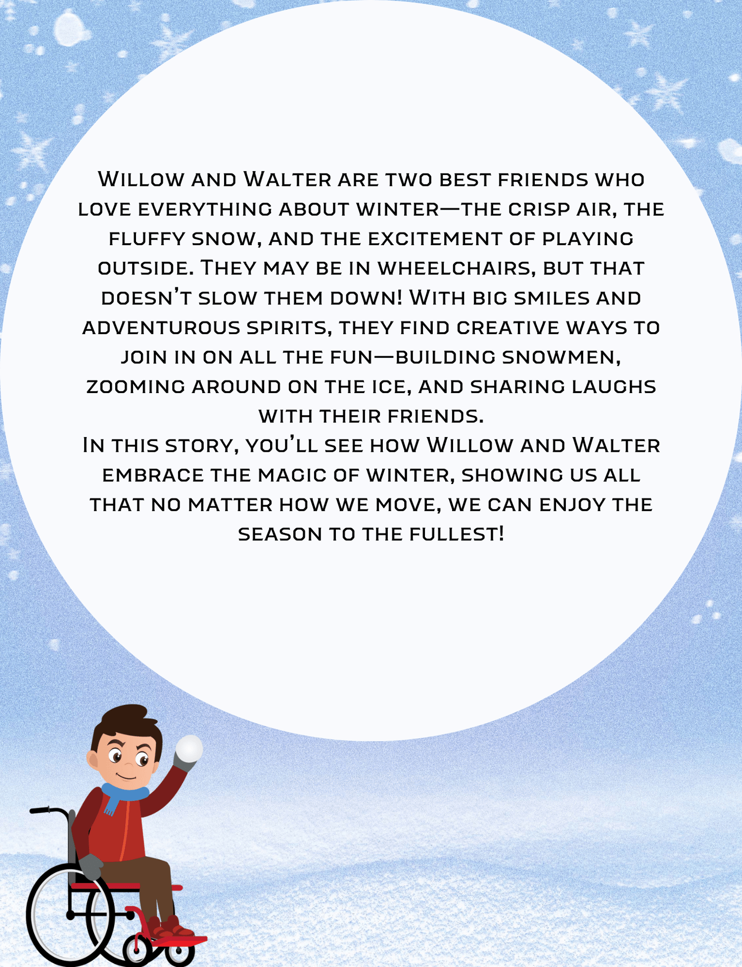 Willow and Walter are two best friends who love everything about winter-the crisp air, the fluffy snow, and the excitement of playing outside. They may be in wheelchairs, but that doesn't slow them down! With big smiles and adventurous spirits, they find creative ways to join in on all the fun-building snowmen, zooming around on the ice, and sharing laughs with their friends. In this story, you'll see how Willow and Walter embrace the magic of winter, showing us all that no matter how we move, we can enjoy the season to the fullest!