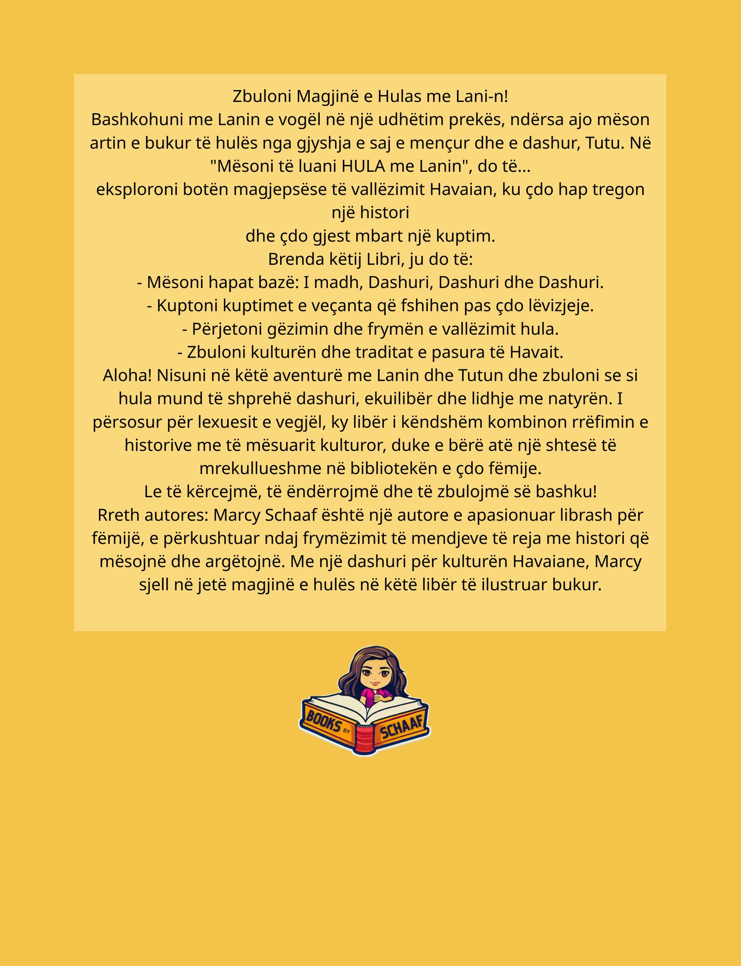 Mëso të Vallëzosh Hula me Lani është një libër dygjuhësh (Shqip–Anglisht) për fëmijë dhe familje, që prezanton vallëzimin hula si një mënyrë për të treguar histori, për të shprehur ndjenja dhe për të treguar respekt ndaj kulturës dhe natyrës.
