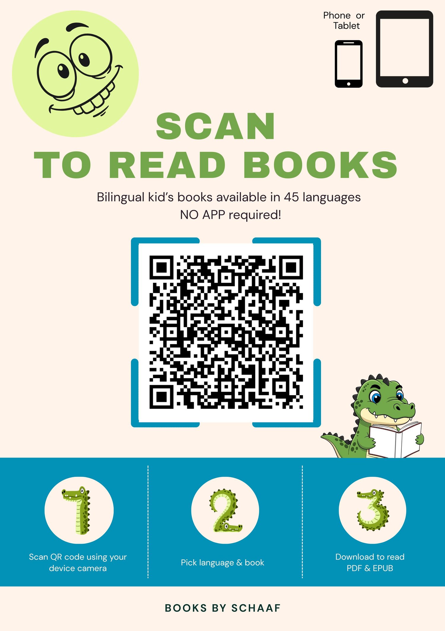 We provide a single, branded QR code that gives families instant access to a curated library of children’s digital books in multiple languages.